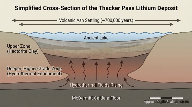 Over millions of years, two things happened to that claystone that made it extraordinary. First, ordinary groundwater chemistry altered the volcanic glass into lithium-bearing clay minerals, mainly a type called hectorite. That alone would make a decent deposit. But then a second wave of heat-driven fluids—pushed upward by renewed magmatic activity beneath the caldera floor—supercharged the deepest layers, converting hectorite into a much richer mineral called tainiolite-like illite, with lithium concentrations two to three times higher than anything found in comparable deposits worldwide. A 2020 study by Castor and Henry in the journal Minerals described this dual enrichment process in detail.
