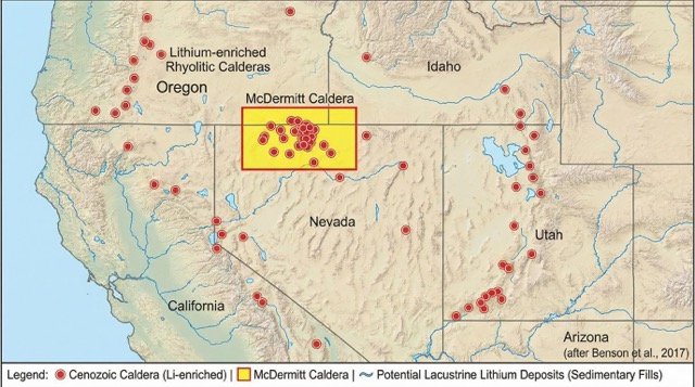 The deposit sits at the southern edge of the McDermitt Caldera, a massive volcanic structure roughly 45 km by 30 km that straddles the Nevada–Oregon border. The caldera formed about 16.4 million years ago when a supervolcano erupted and collapsed—part of the same geologic system that eventually produced Yellowstone. After the collapse, a lake filled the basin for roughly 700,000 years. Volcanic ash drifted into that lake and settled into layers of fine-grained claystone, some of it more than 200 meters thick.